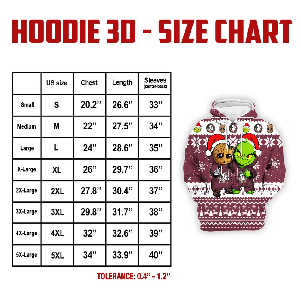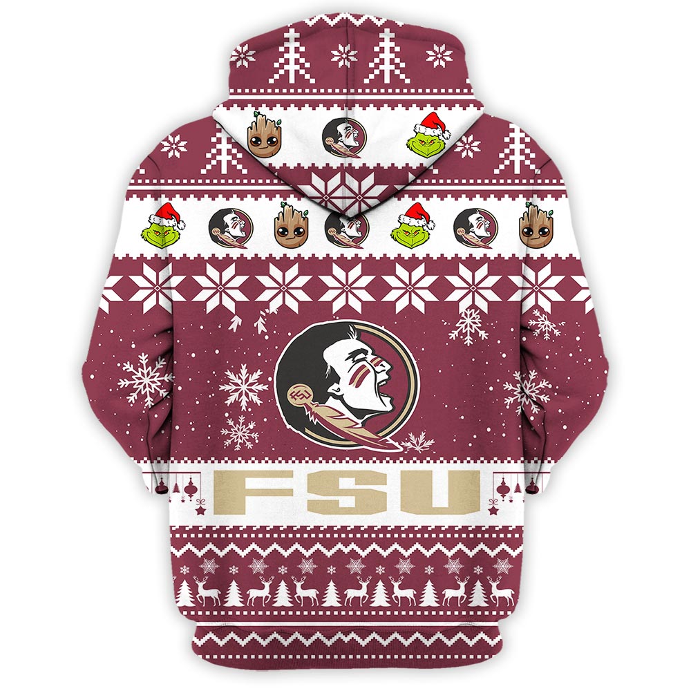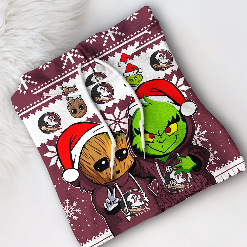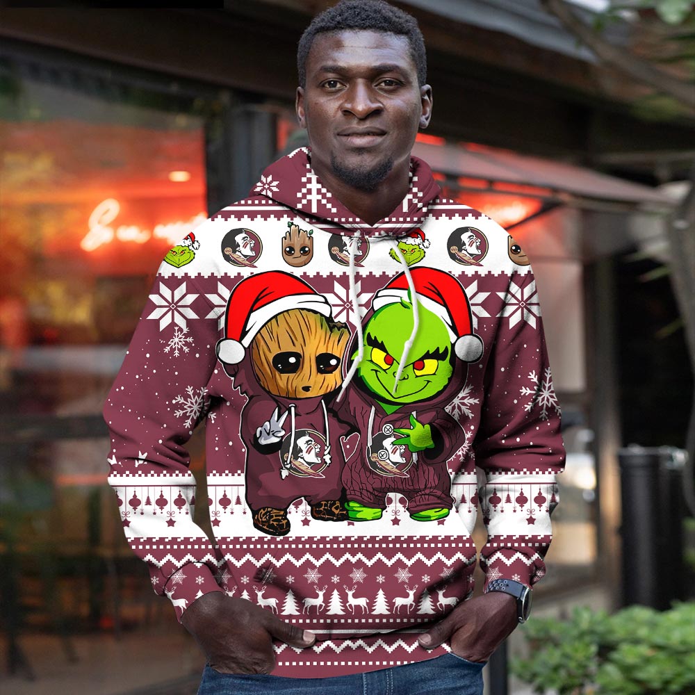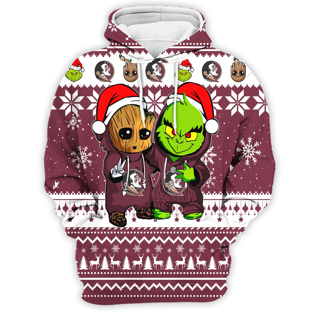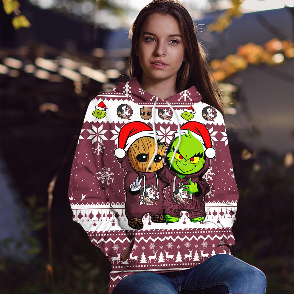 Florida State Seminoles Baby Groot And Grinch Best Friends Football American Ugly Christmas Sweater New Trends For Fans Club Gifts Unisex 3D Hoodie