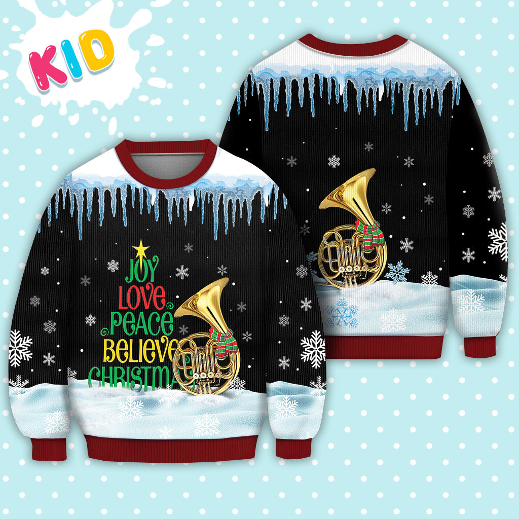 Horn Joy Love Peace Believe Christmas Ugly Christmas Sweater – Lover Xmas Sweater Gift
