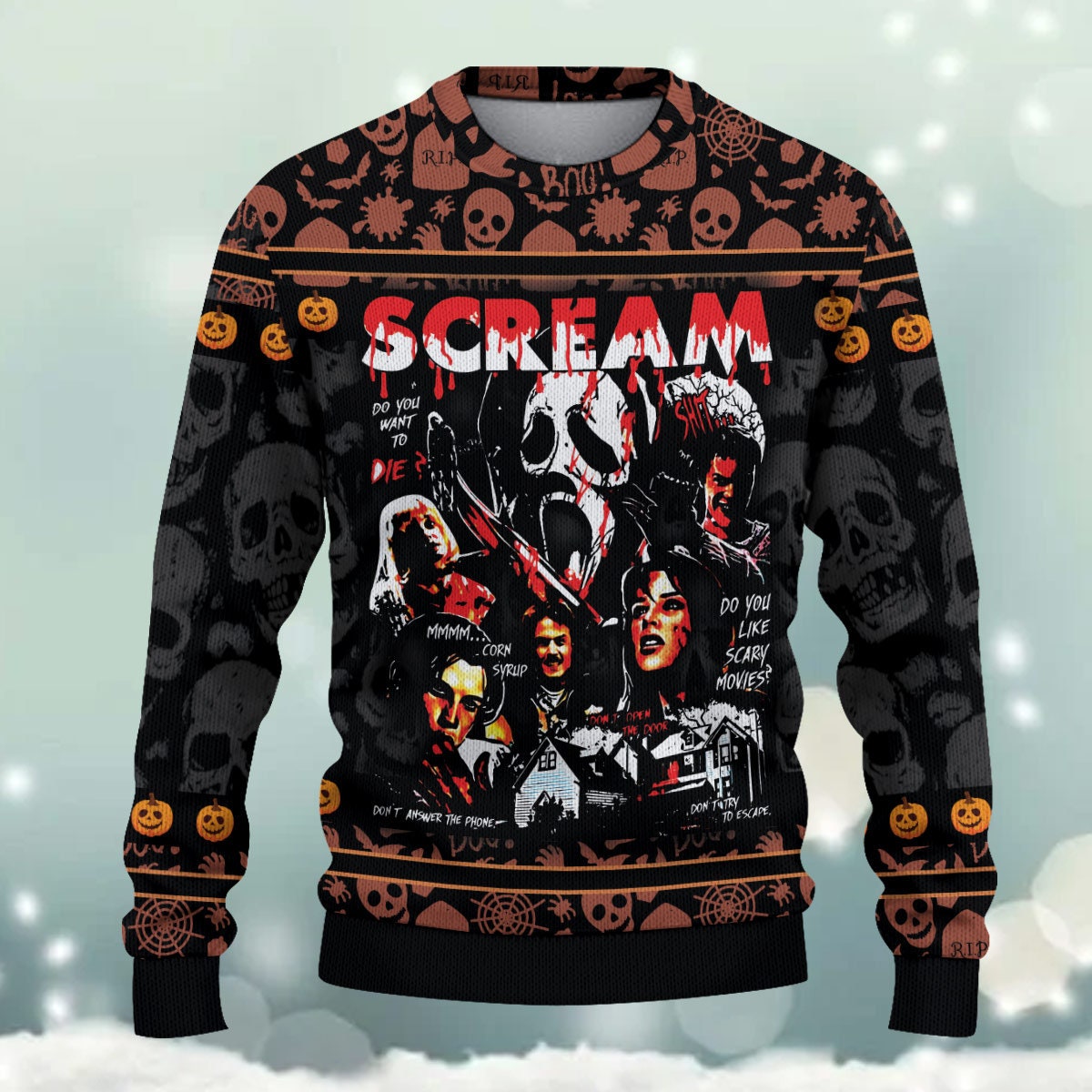 Horror Ugly Sweater Scream Movie Characters Halloween Christmas, Scream Movie Ugly Sweater Christmas, All Over Print Sweater, Ugly Sweater