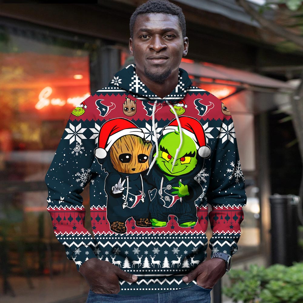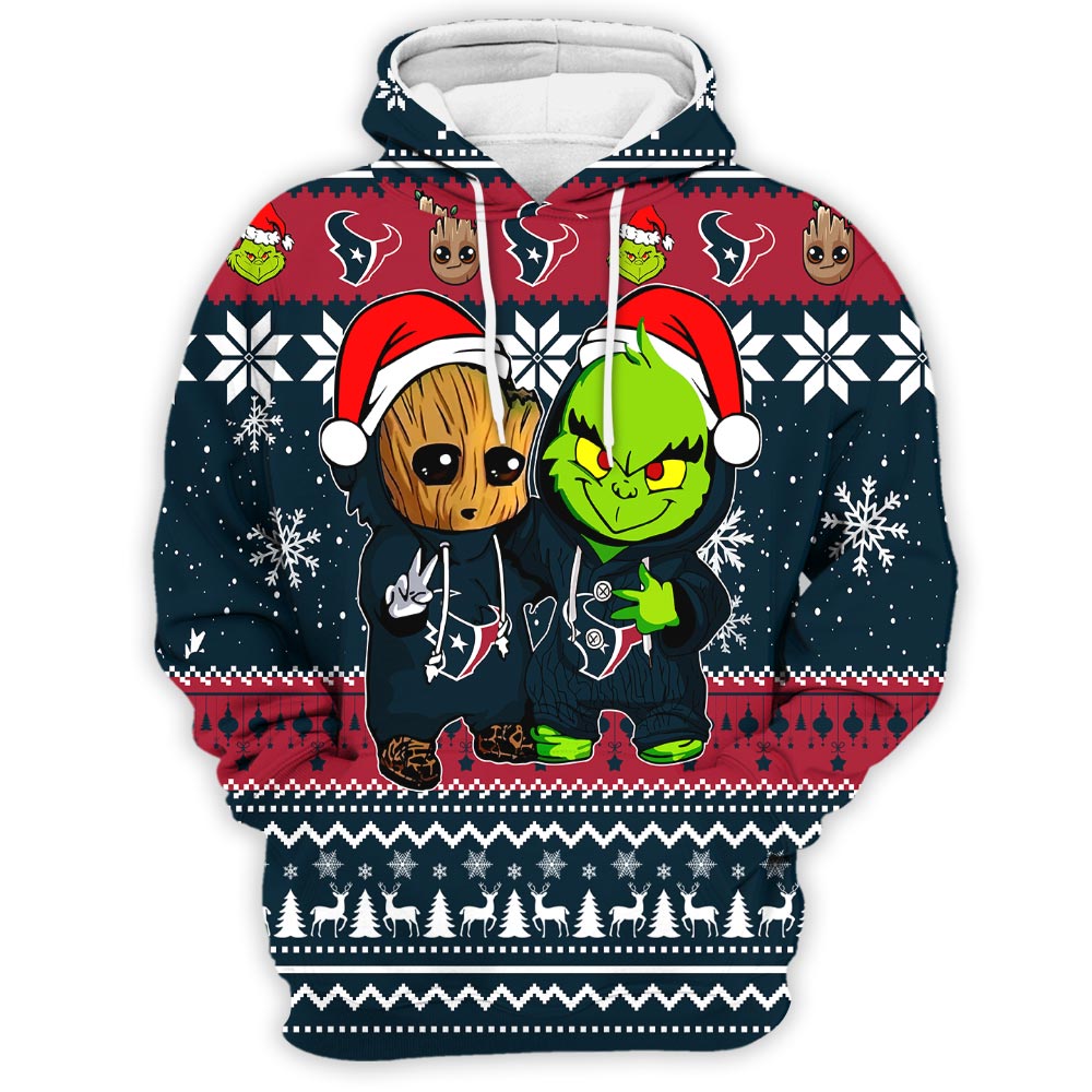Houston Texans Baby Groot And Grinch Best Friends Football American Ugly Christmas Sweater New Trends For Fans Club Gifts Unisex 3D Hoodie