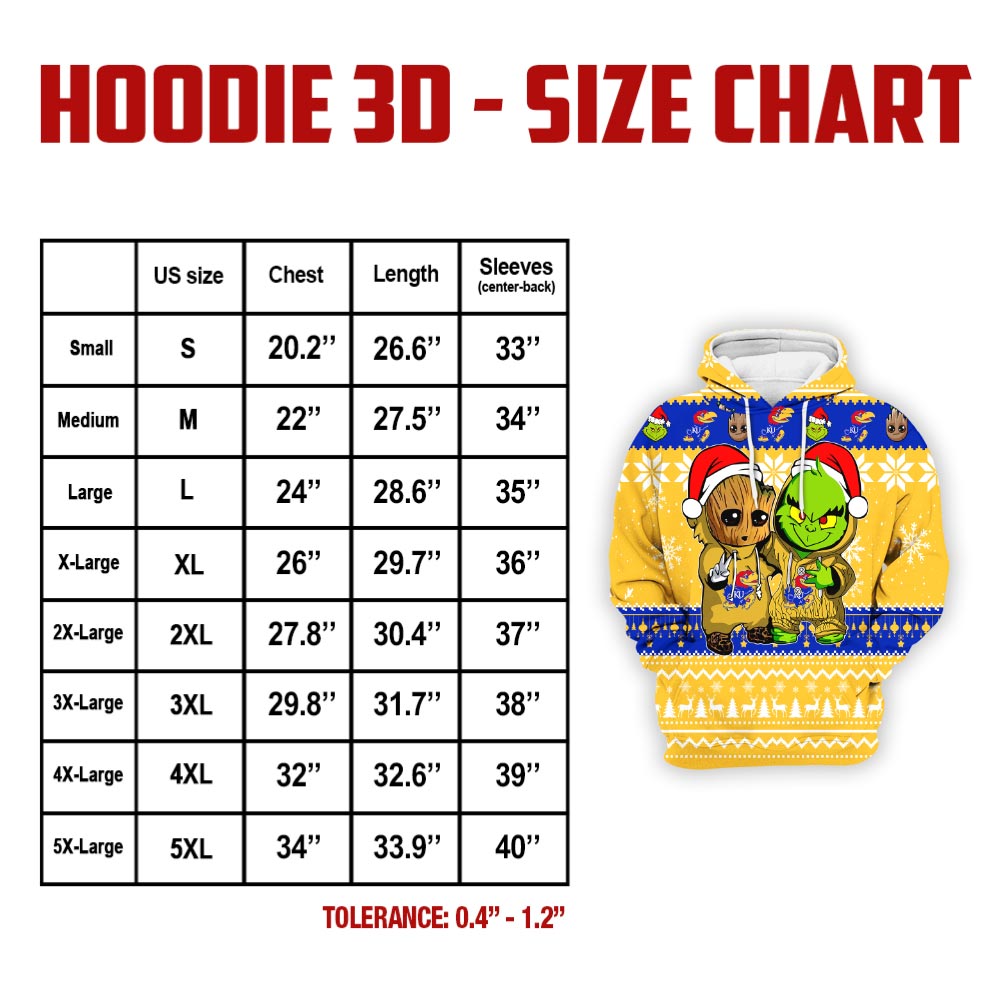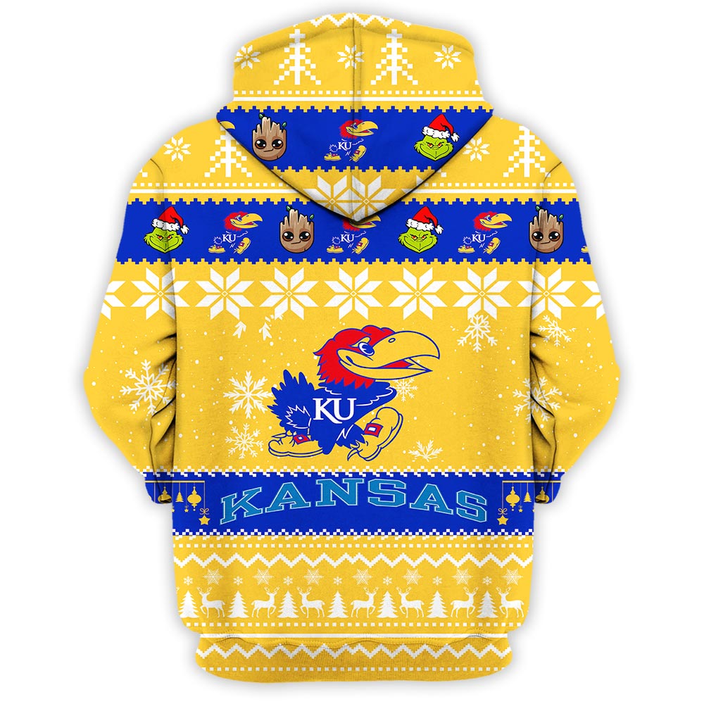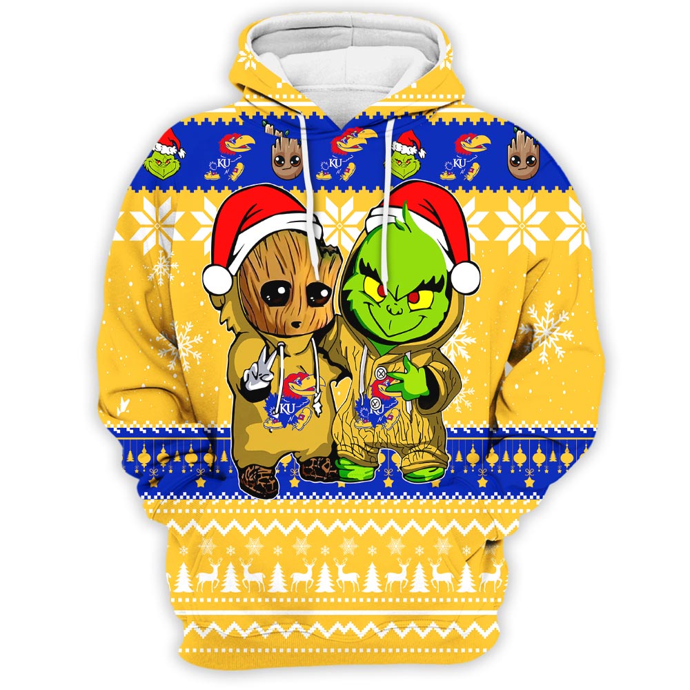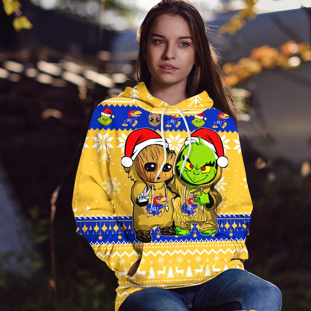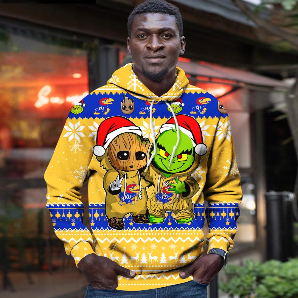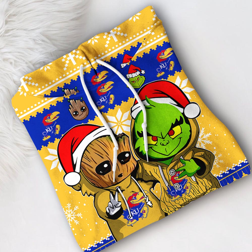 Kansas Jayhawks Baby Groot And Grinch Best Friends Football American Ugly Christmas Sweater New Trends For Fans Club Gifts Unisex 3D Hoodie