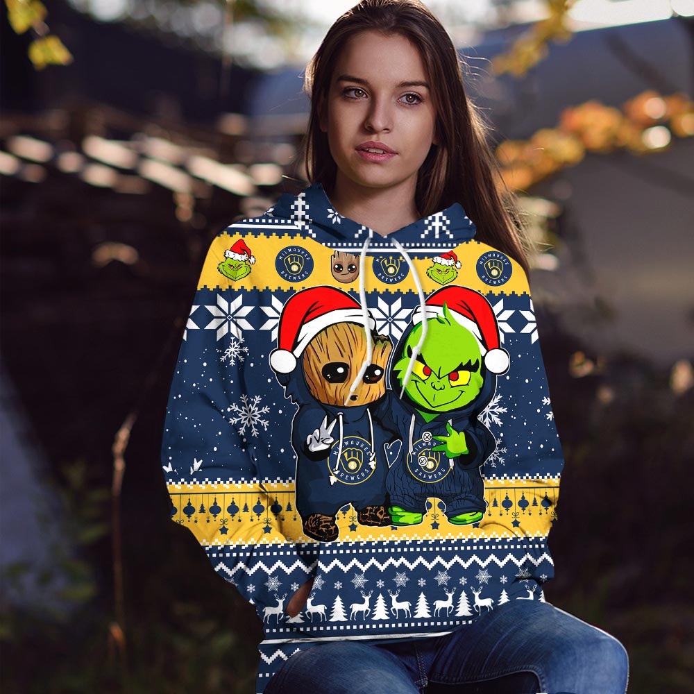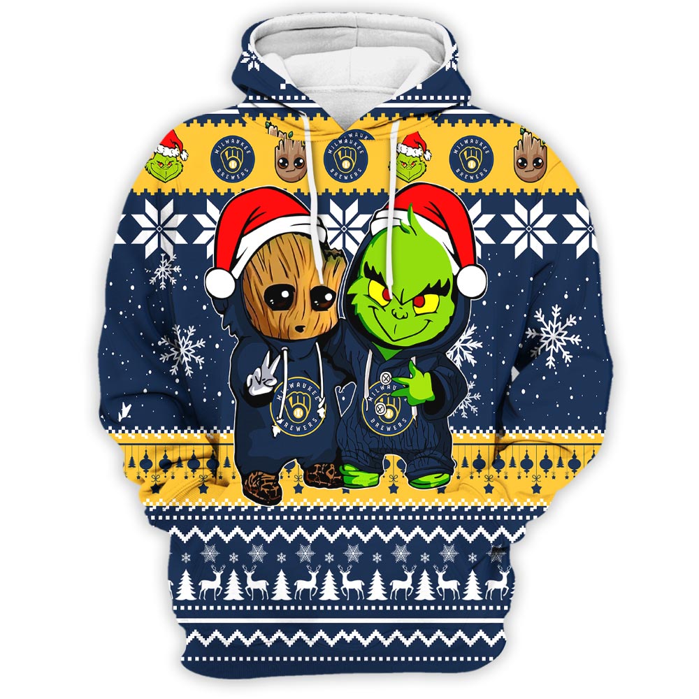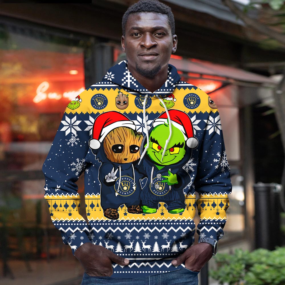 Milwaukee Brewers Baby Groot And Grinch Best Friends Football American Ugly Christmas Sweater New Trends For Fans Club Gifts Unisex 3D Hoodie