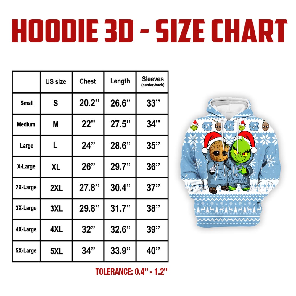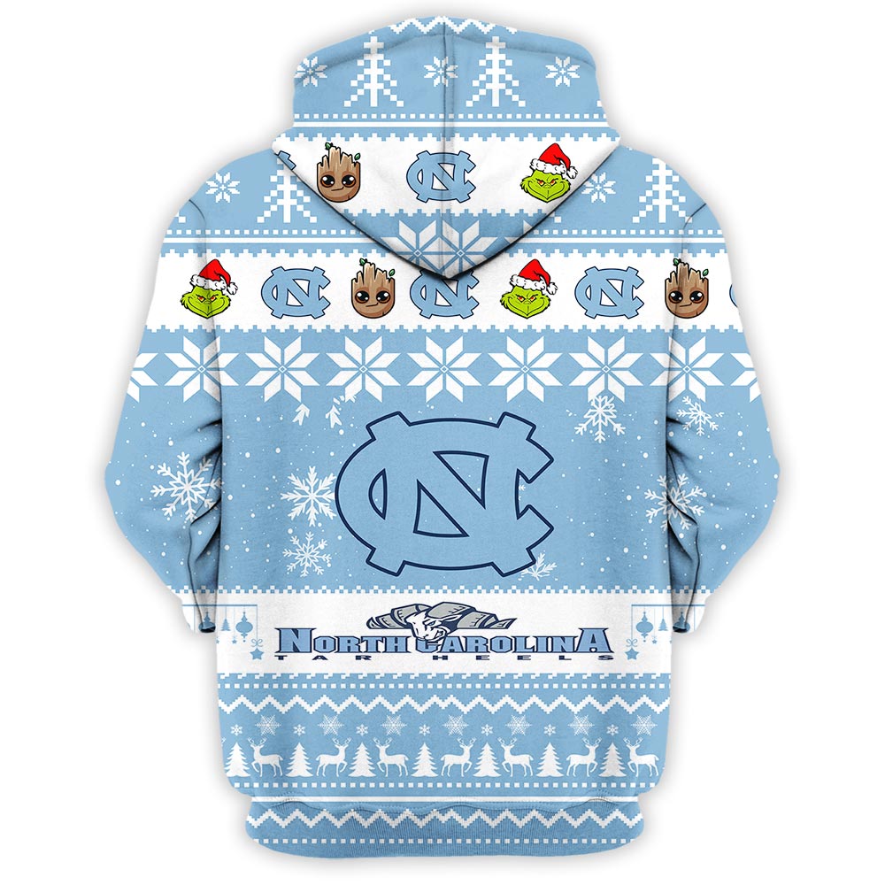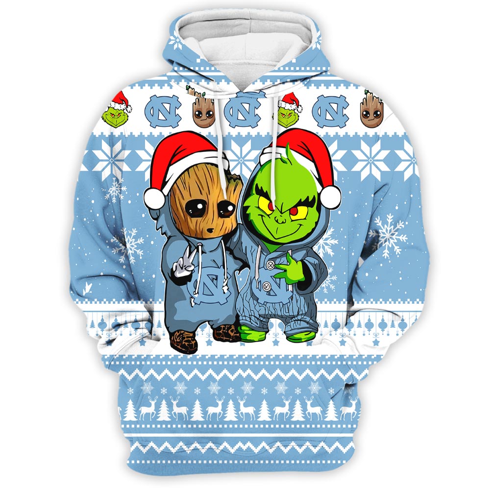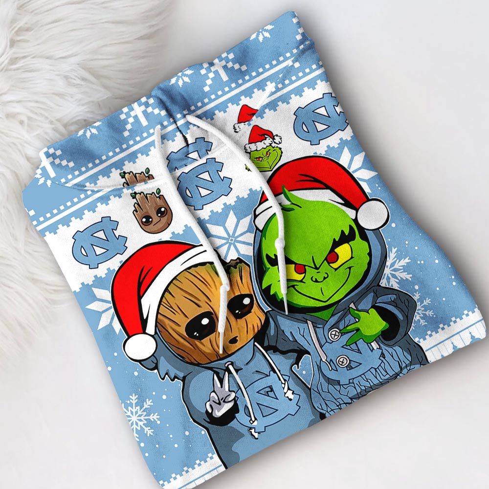 North Carolina Tar Heels Baby Groot And Grinch Best Friends Football American Ugly Christmas Sweater New Trends For Fans Club Gifts Unisex 3D Hoodie