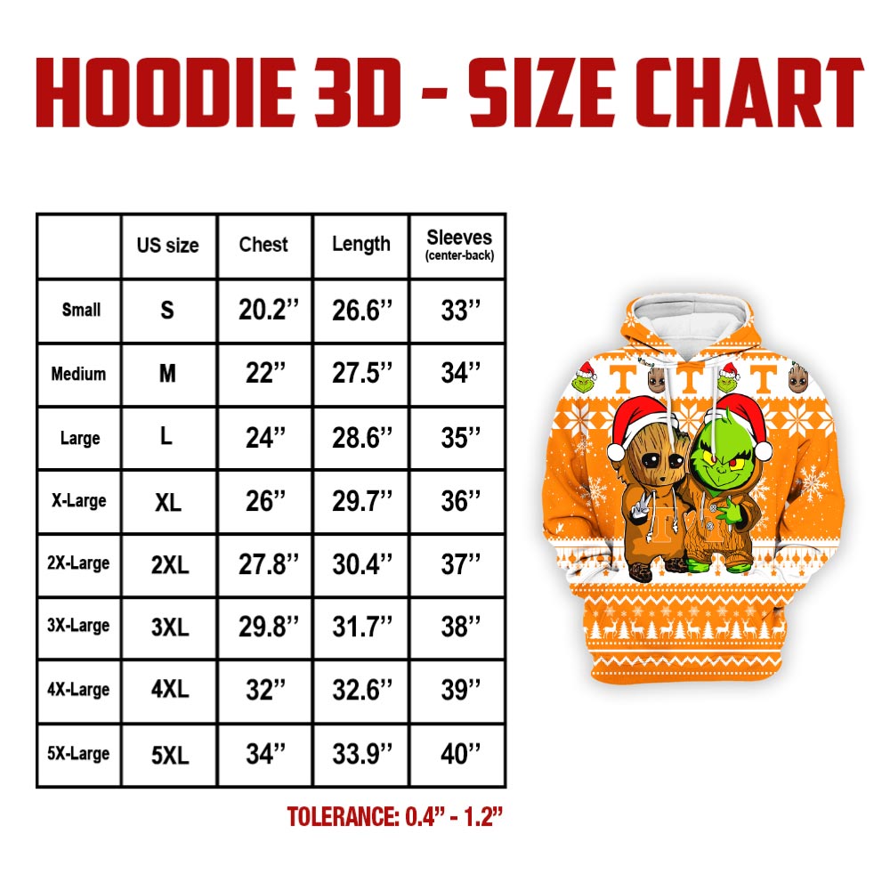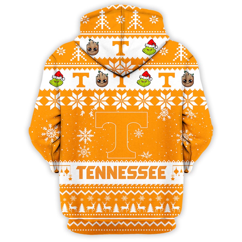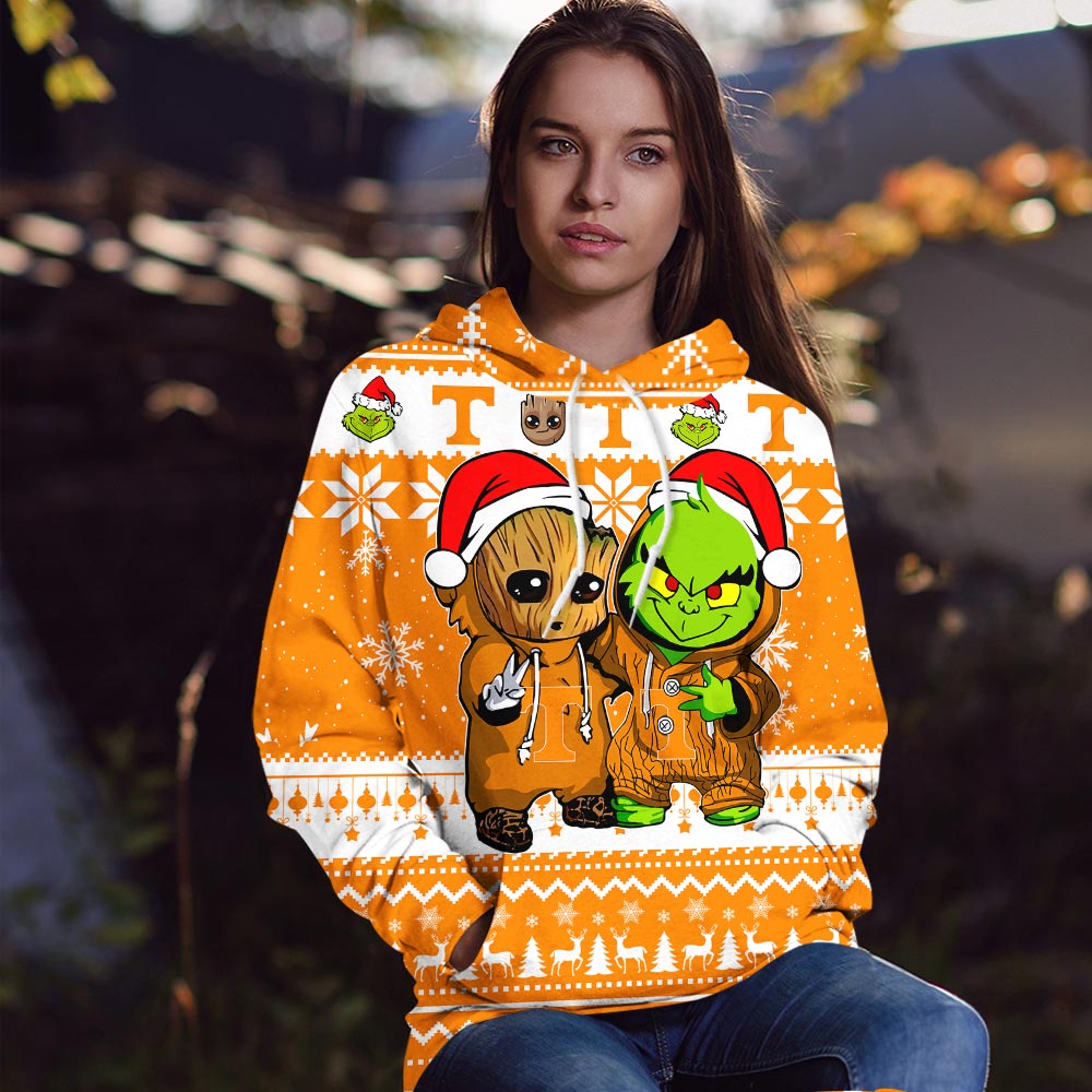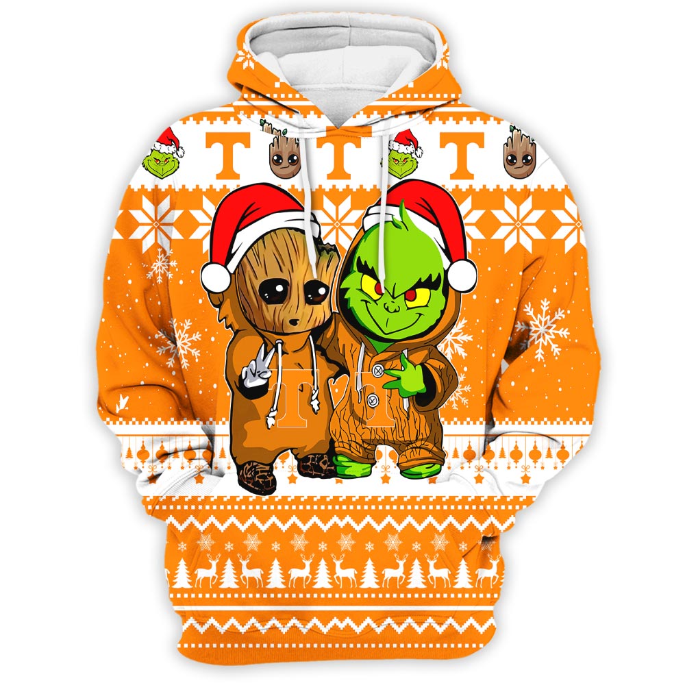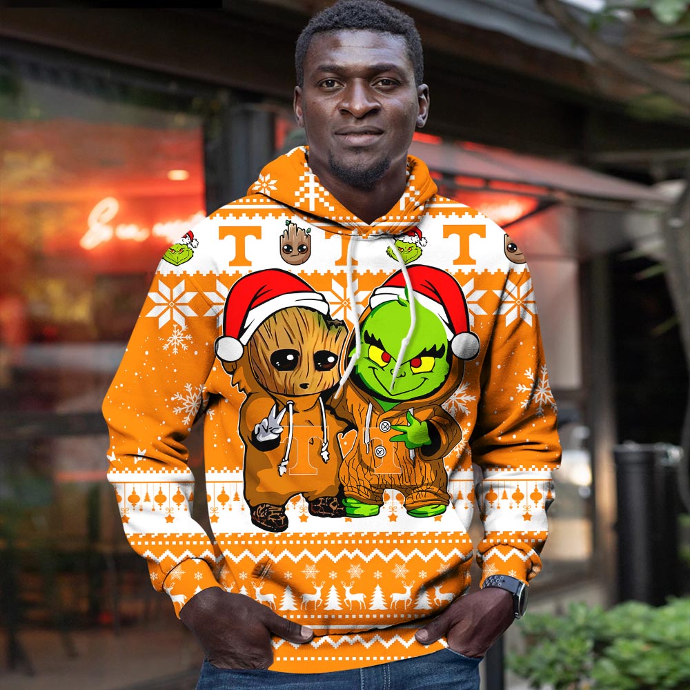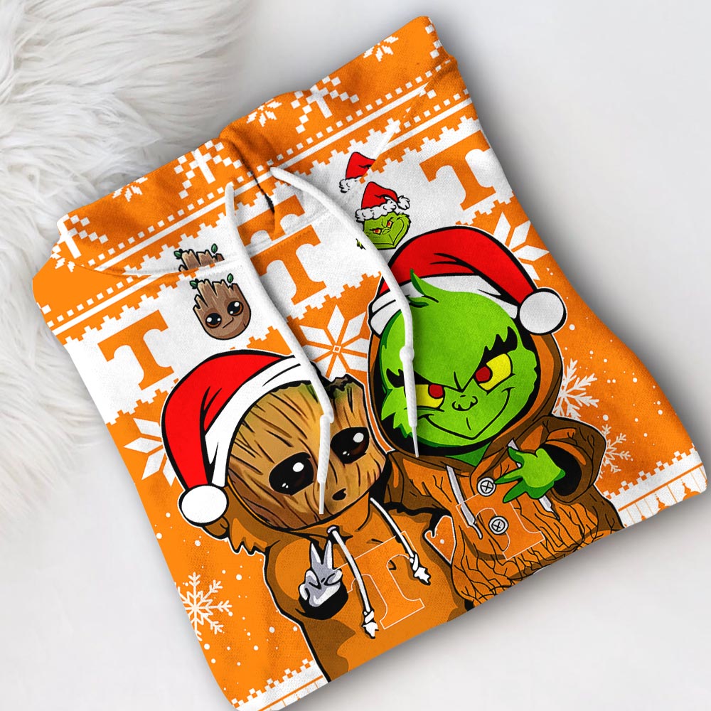 Tennessee Volunteers Baby Groot And Grinch Best Friends Football American Ugly Christmas Sweater New Trends For Fans Club Gifts Unisex 3D Hoodie