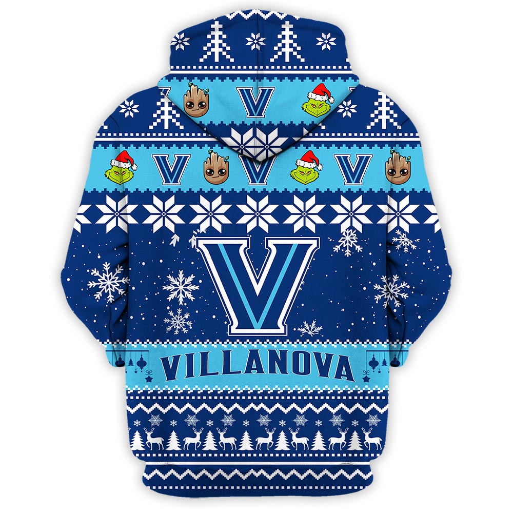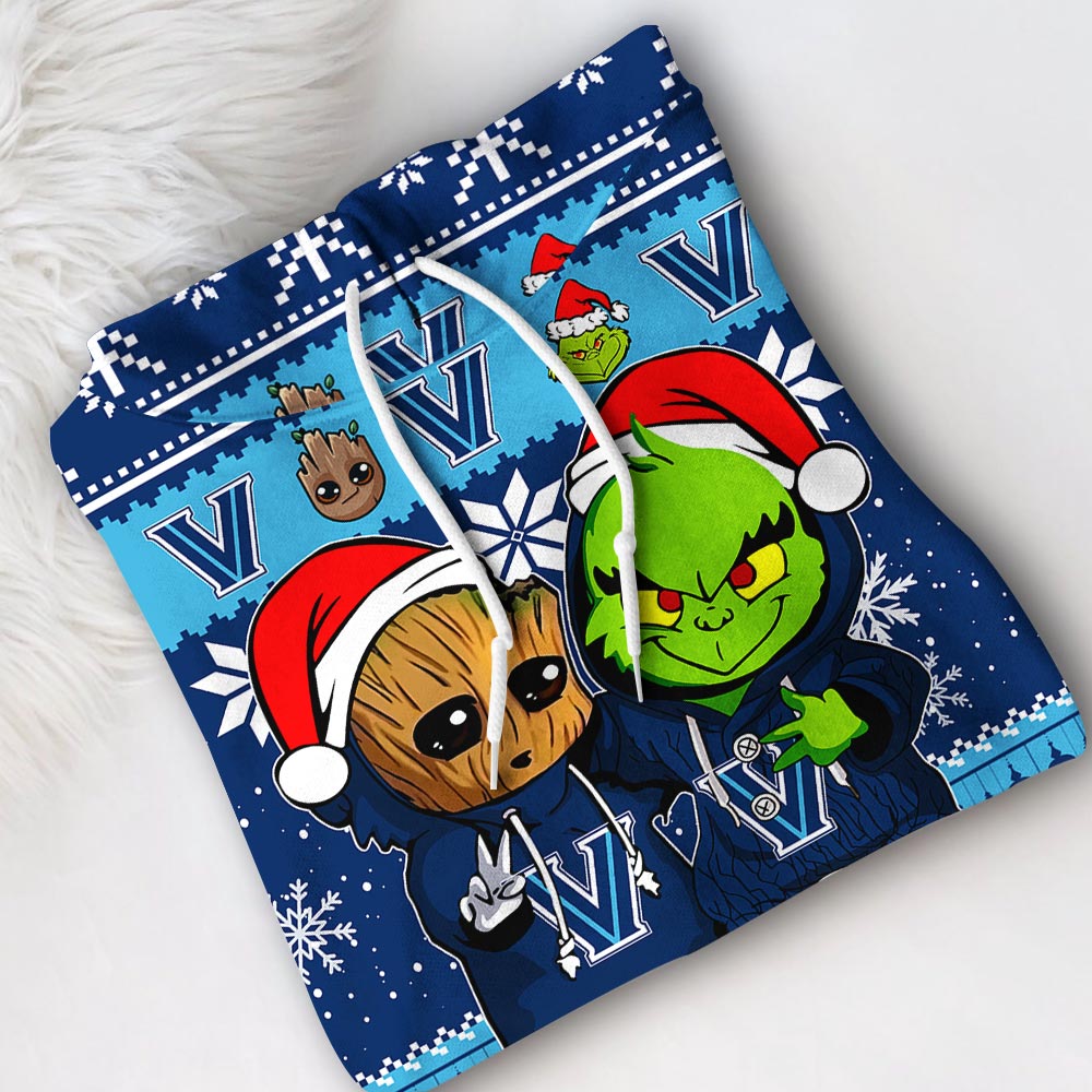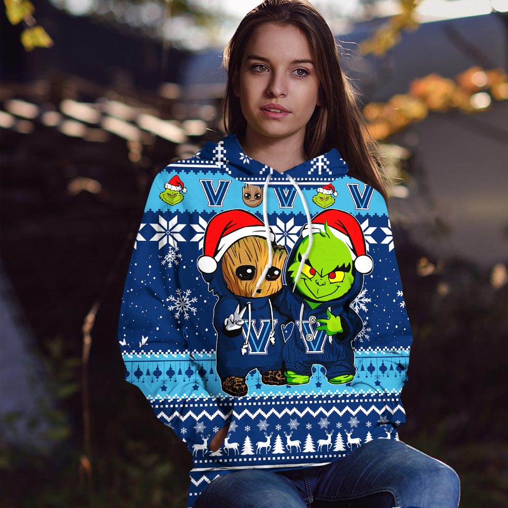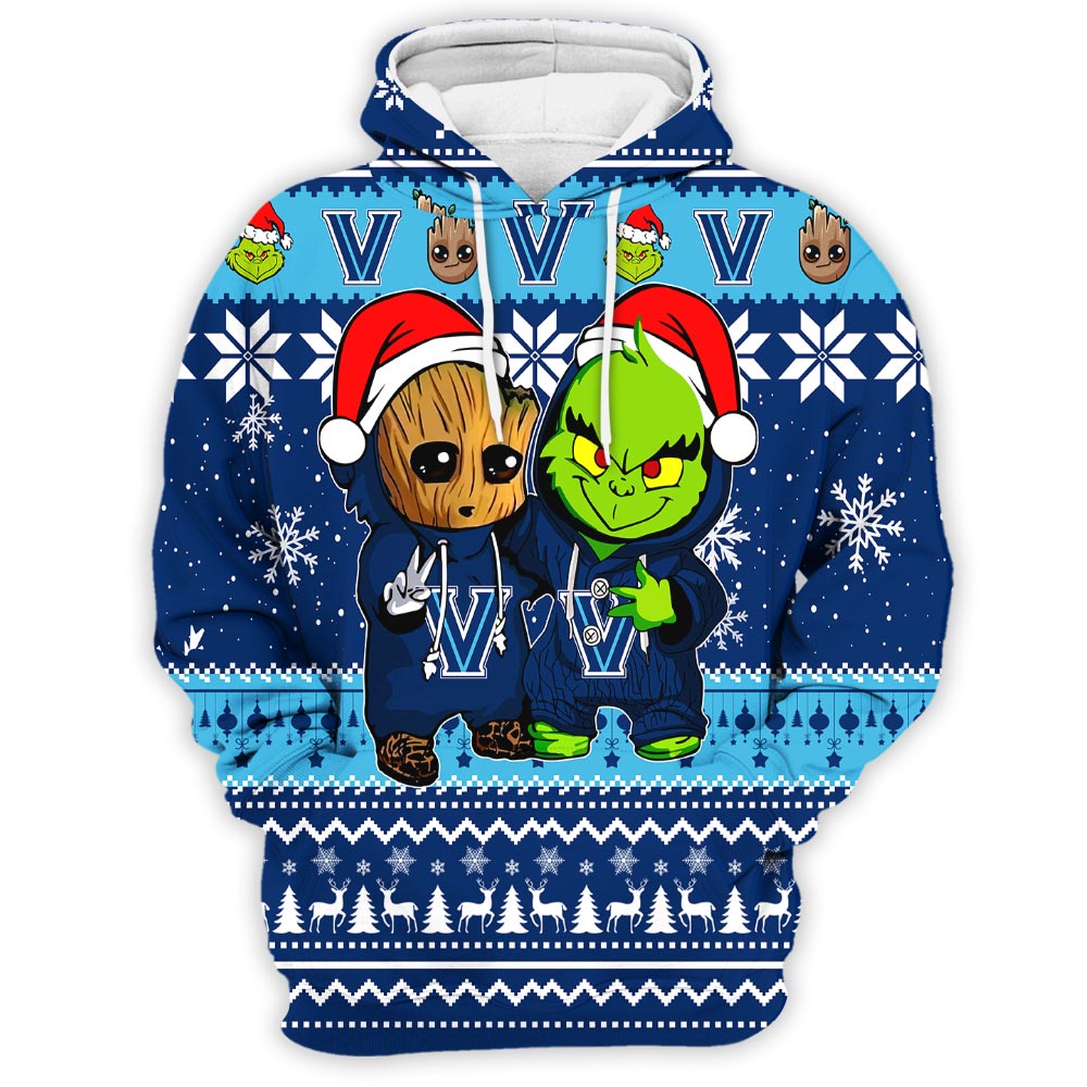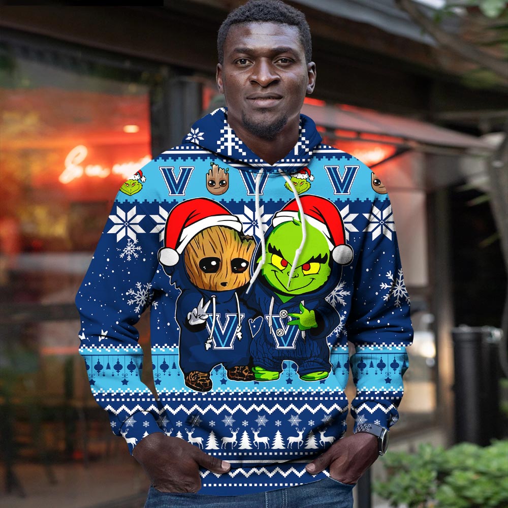 Villanova Wildcats Baby Groot And Grinch Best Friends Football American Ugly Christmas Sweater New Trends For Fans Club Gifts Unisex 3D Hoodie